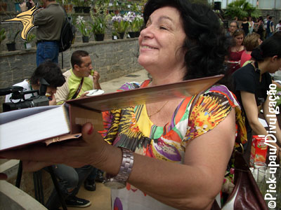 Vera Bononi, assina livro durante evento. |